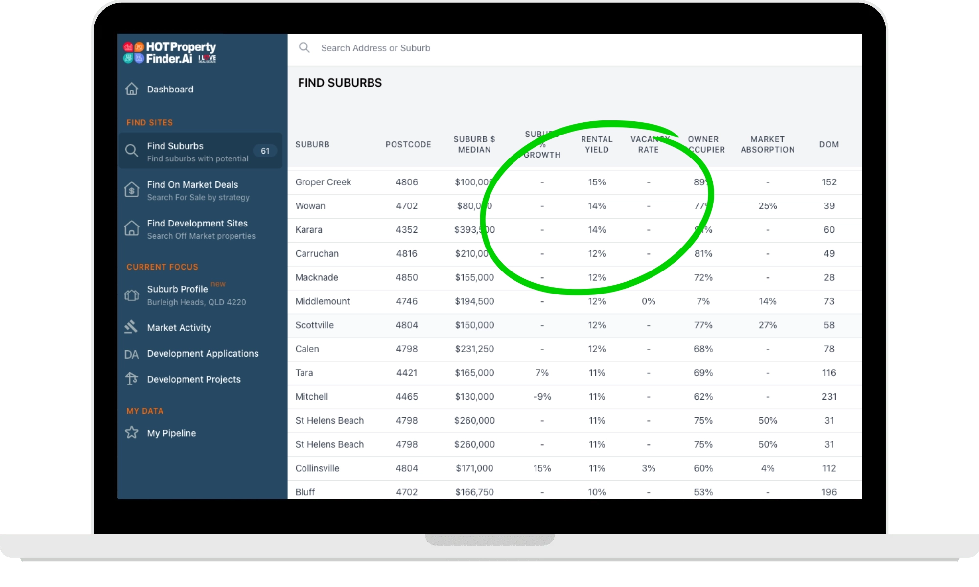 Well, with HotPropertyFinder.Ai you’ll be able to instantly search and immediately find the suburbs across Australia that have the highest yields and cashflow opportunities.
